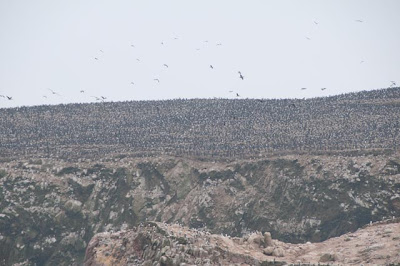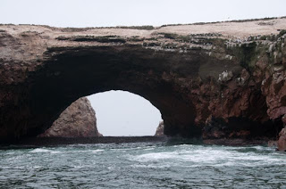 Una media hora en mar abierto hasta que llegamos a unos islotes abarrotados de vida. Impresiona el contraste entre la abundancia de vida animal y la ausencia total de vegetación. Las islas Ballestas están habitadas todo el ano por colonias inmensas de lobos marinos, pingüinos y millones (si, millones) de pájaros. La cantidad de aves explica la capa blanca de nitrógeno asoleado (el excremento de los pájaros) que en lugares llega a tener 50 metros de profundidad. Ya desde el tiempo de los Incas el guano era reconocido como buen fertilizante, a mediados del siglo XIX llegó a convertirse en el primer producto de exportacion del Peru. Cada tanto, aun hoy en día con la competencia de los fertilizantes sintéticos, se recoge el guano y se exporta.