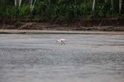 Nos despedimos del Amazonia Lodge.Hoy nos tocan siete horas de paseo por el río Madre de Dios hasta el siguiente albergue.Nos sentamos en el bote a disfrutar del paisaje, pendientes de las garzas y las capibaras al borde del río, de las tortugas que se asolean sobre los viejos troncos,buscando monos en las copas de los árboles. Suso nos asiste con la biblia de la selva, el Neotropical Companion de Kricher, fuente de todo el saber: “Saben que en un árbol del Amazonas se han encontrado más especies de hormigas que las que hay en todas la Gran Bretaña?” nos dice Suso y nosotros boquiabiertos. Roger nos cuenta de Clotilde, una caimana malcriada que acostumbrada a alimentarse de los restos de comida de uno de los lodges terminó comiéndose a un incauto fotógrafo.Horas y horas de verde y de nubes, de una tertulia entretenida, un larguísimo río parecido a los que recorrió el primo Teodoro.Al comienzo de la tarde llegamos al albergue donde pasaríamos nuestras últimas tres noches.