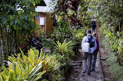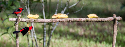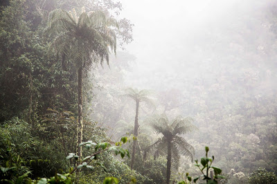 Salimos de Paucartambo con rumbo a las Tres Cruces, un paraje alejado desde donde cuentan se ve en el solsticio de invierno el amanecer más vistoso del planeta (Osaka, creo haber escuchado, le hace competencia).En ese mismo lugar, allí donde se bifurca el camino, anunciado por un modesto letrero y un pequeño mapa envuelto en neblina, queda la única entrada al Manu. Hacía pocos días que Roger había regresado de organizar la primera edición del ultramaratón del Manu, casi cuarenta concursantes de distintos países en un recorrido agotador de 230 kilómetros.Nuestra camioneta se detiene muy cerca de donde comenzó la carrera, nos bajamos y comenzamos una maravillosa caminata de unas cuantas horas por el bosque húmedo nublado.Laberintos de árboles cubiertos de musgos y líquenes, helechos inmensos del tamaño de palmeras, hilos de agua y una la orquesta de pájaros escondida en el bosque.Nosotros felices sendero abajo hasta que llegamos a una encrucijada en la que Roger apuntando hacia arriba nos dijo: “sólo falta una media hora de subida”.Comenzaba, sin nosotros saberlo, nuestro mini-maratón.La subida se hizo cada vez más empinada, no tardamos mucho en comenzar a preguntarle a Roger cuánto faltaba, la animada conversación tomó una pausa, nos hacía falta el aire, había que concentrarnos y seguir trepando.Varias “medias horas” después, ya oscureciendo, Roger decidió separarse para acelerar el paso y traernos linternas.Al rato, llegó con luz y nos guió a un pequeño campamento donde debía esperarnos Walter con la camioneta.Para sorpresa de todos Walter no estaba.Le tocó de nuevo a Roger caminar (correr) camino abajo en la oscuridad hasta que aparecieron Walter y la camioneta.Dos horas más de camino por una carretera algo precaria y poco transitada –la vieja via marginal de la selva, la que quiso construir Belaúnde Terry inspirado en el faraónico Juscelino Kubistchek-, pasamos túneles de tierra, puentes endebles y montones de charcos antes de llegar a nuestro destino final: El Lodge del Gallito de las Rocas.Dejamos nuestros bultos en las habitaciones, cenamos y nos dimos las buenas noches, a las 5 de la mañana del día siguiente debíamos reportarnos para ir a ver Gallitos, el estupendo pájaro rojo, el ave nacional del Perú.Traté de tomar una ducha a la luz de la vela pero no logré descubrir, al menos esa noche, que aquí en la selva las letras “C” y “H” de los controles del agua están al revés, que las letras no corresponden a “Hot” y “Cold” sino a “Helada” y “Caliente”.