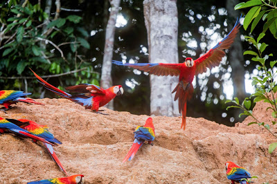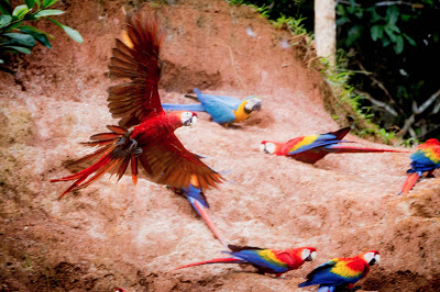 A la mañana siguiente salimos muy temprano a ver guacamayos en un “clay lick”, una pared de arcilla adonde vienen algunos pájaros para nutrirse de minerales. La caminata es entretenida, nos detenemos para ver hormigas, arañas, hongos y enredaderas. Gran parte de la ruta es bosque inundable, terreno que durante los meses de lluvia está casi totalmente cubierto de agua. Frente al clay lick hay una plataforma de madera donde nos sentamos a esperar los guacamayos. Al poco rato vemos acercarse algunos tímidamente. Baja uno con cuidado y se posa sobre la pared de arcilla. A los pocos minutos nos sorprende una explosión de color, decenas de guacamayos, un revoloteo de amarillo, verde, azul y rojo. Muchos vienen atraídos por el maíz que le colocan en la pared de arcilla, algunos aprovechan para tomar su dosis de minerales. De vuelta tenemos la suerte de ver un grupo de monos tamarindo y un tímido agouti.