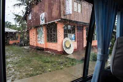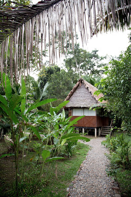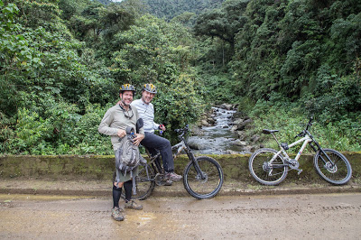 El próximo tramo es en bicicleta. Recogemos nuestras maletas, las colocamos en la camioneta y nos lanzamos – encascados y enguantados- carretera abajo escoltados por Walter. Poco a poco comienzan a salir los niños que llevamos por dentro, nos tele-transportamos a nuestra infancia, rodamos felices entre el barro y las piedras. Comienza la lluvia y con ella desaparecen las últimas inhibiciones, ahora sí que somos una pandilla de muchachitos haciendo carrera con Pepe a la cabeza. Estamos todos empapados y llenos de lodo, embalados disfrutando del paisaje, no queremos que se acabe. Termina la bajada y llegamos a un pequeño caserío donde compramos agua y hojas de coca. Allí Roger nos ofrece volver a la camioneta pero su moción es derrotada por unanimidad, todos queremos seguir montando bici hasta el fin del mundo, hasta que la carretera se dé de bruces contra el río. Unas horas más tarde llegamos embarradísimos al pueblo donde almorzaríamos, ya hace rato que estamos en el Departamento de Madre de Dios. Nos bajamos de nuestras bicicletas y nos duchamos en un pequeño y desvencijado hostal al borde del camino. Le entregamos nuestra ropa sucia a la dueña de la más moderna lavadora Samsung del Amazonas, toda la modernidad en un cubo, para que nos la lave mientras comemos. Almorzamos arrullados por la lluvia y el ciclo de spinning del prodigio coreano. Esa misma tarde, luego de un breve paseo por el río, llegamos a nuestro próximo albergue, el venerable Amazonia Lodge.