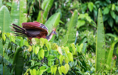 La penúltima mañana salimos de paseo a un lago. Vamos en un bote sin motor deslizándonos sobre las aguas calmadas atentos a los matorrales y los árboles. En la orilla vemos grupos de Hoatzins, un ave torpe con el copete despeinado, un raro pájaro rumiante; murciélagos, una familia de monos aulladores flojos y peludos, buscamos sin éxito una pareja de nutrias que cuentan vive allí. A nuestro regreso Jana, la de la vista biónica, descubre un lindo perezoso colgado de una rama. Esa tarde Tapir y Carachupa deciden tomar una siesta mientras que Suso y Jana vuelven a visitar el clay lick de las guacamayas.